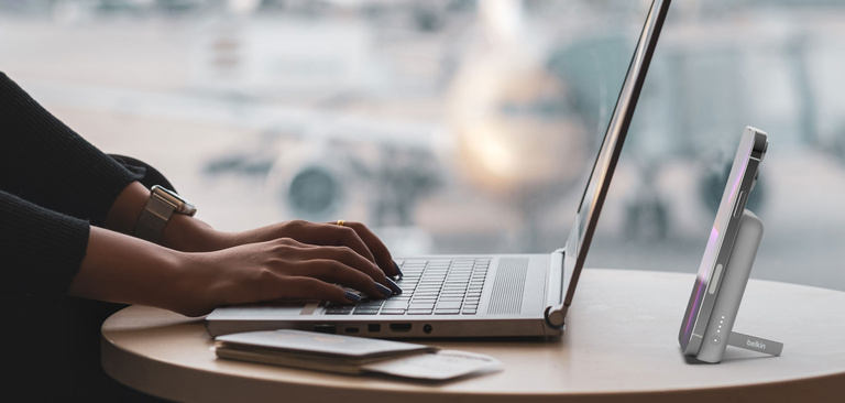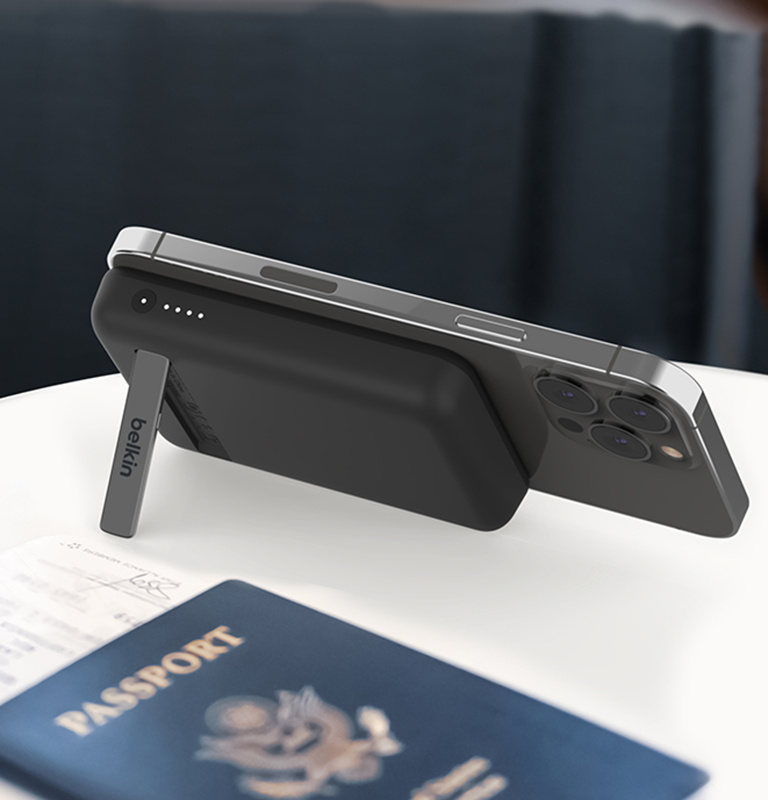 Our portable Magnetic Wireless Power Bank 5K + Stand delivers a safe 7.5W of wireless charging power to your device without cables or a need to connect to a power source. The fold-out stand offers a convenient and hands-free way to stream or video call while you charge.