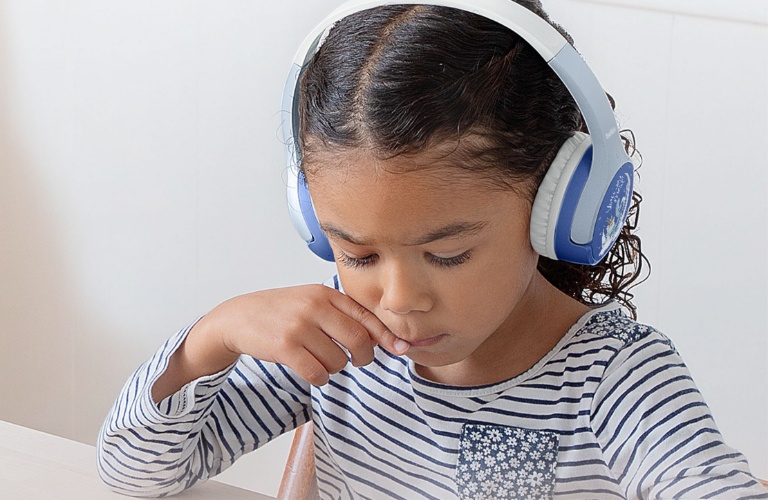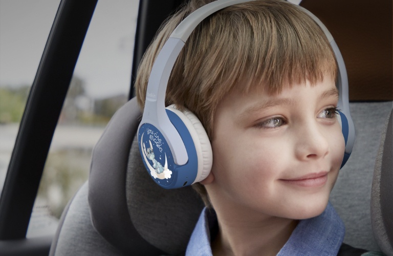 Perfect for distance learning, long car rides, and keeping them entertained, these on-ear headphones have been designed with kids 3 and up in mind. A volume cap of 85dB* protects young ears, and extended battery life keeps them listening all day long.