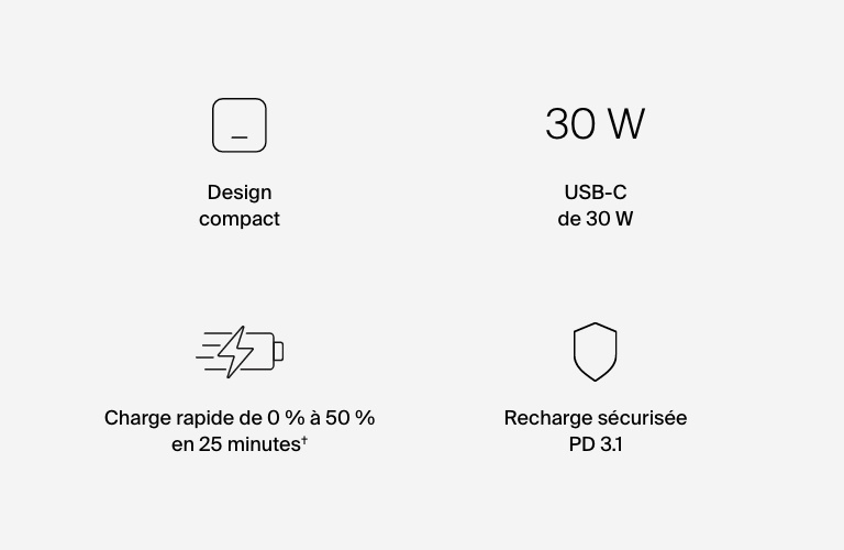 †La technologie USB-C PD charge un iPhone 16 de 0 à 50 % en 24 minutes ou le Samsung S25 de 0 à 50 % en 26 minutes quand elle est utilisée avec un câble USB-C vers USB-C. Le temps de charge varie en raison des facteurs environnementaux ; les résultats réels peuvent varier.