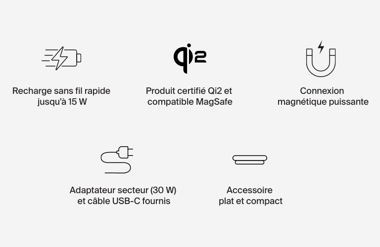 Profitez des avantages qu’offre le chargement sans fil rapide avec la Qi2 avec une puissance maximale de 15 W pour votre iPhone 15 et autres appareils compatibles Qi2.