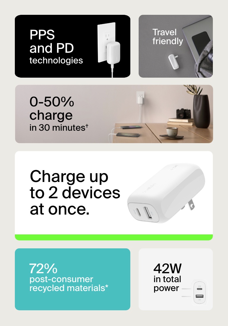 Fast charge an iPhone or Samsung smartphone while you charge another device at the same time with our Dual Wall Charger 42W. Dual ports include a 30W USB-C port and a 12W USB-A port. It’s USB-C PD 3.0 certified to deliver fast charging of 0-50% in 21 minutes for iPhone or 0-50% in 26 minutes for Samsung††.
