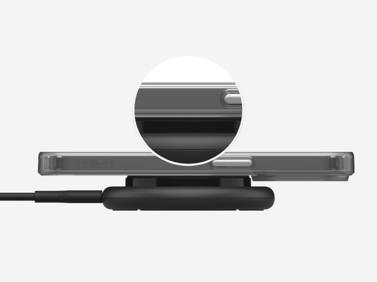 ‡Requires magnetic Qi2 or MagSafe compatible case†Based on internal testing. Belkin Qi2 15W wireless charger charges iPhone 15 from 0-50% up to 2x faster than a Qi 5W wireless charger and up to 1.5x faster than a Qi 7.5W wireless charger. Charge time varies with environmental factors; results may vary.