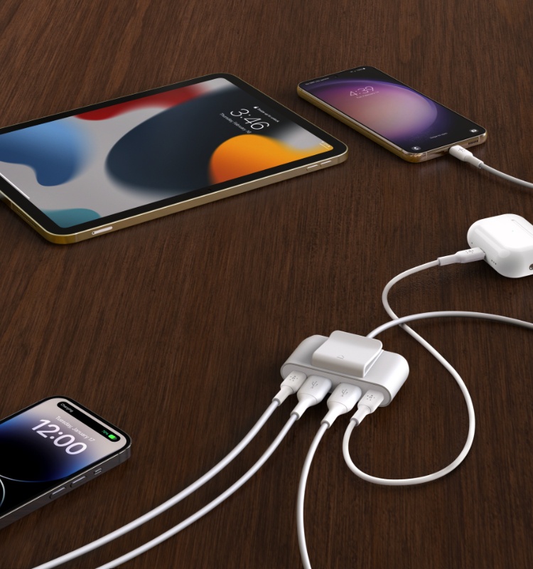 从一个 USB-C 端口,我们的电源扩展器为您提供两个 USB-C 和两个 USB-A 端口,可同时为四台设备充电。 直接端口访问让您可以轻松地与家人和朋友分享电力。 这是为多台设备提供整洁充电环境的简单便捷方式。