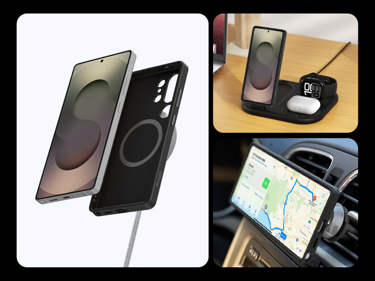 集精美外观与实用功能于一体, 自带快速充电磁吸环及金属支架,让您爱不释手。专为 Samsung Galaxy S25 设计的 Qi2 认证磁吸式手机壳,配有支架,具有高达 2 米的跌落防护能力,有效保护爱机。经 Samsung SMAPP 认证,为 S25 系列实现真正的 15 瓦无线快速充电。† 抗黄变**材质有助于防止保护壳变色。边缘略微凸起,当’面朝下放置时,可防止摄像头和屏幕被刮伤。
