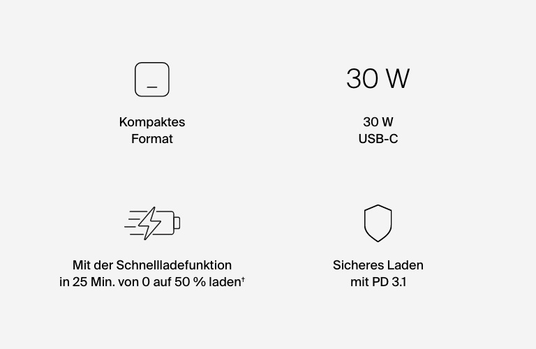 †Die USB-C-PD-Technologie ermöglicht das Laden eines iPhone 16 in 24 Minuten von 0 auf 50 % oder eines Samsung S25 in 26 Minuten von 0 auf 50 %, wenn ein USB-C-/USB-C-Kabel verwendet wird (Kabel nicht enthalten). Ladezeiten sind abhängig von Umgebungsfaktoren; die tatsächlichen Resultate können unterschiedlich sein.