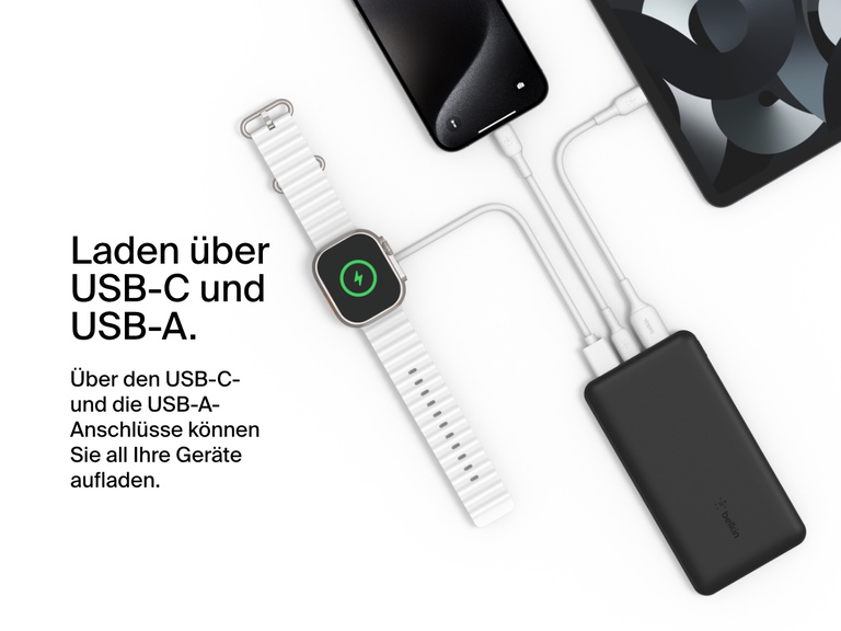 ††Die USB-C-PD-Technologie ermöglicht das Laden eines iPhone 16 Pro oder Samsung Galaxy S23 in 30 Minuten von 0 auf 50 %, wenn ein USB-C-/USB-C-Kabel verwendet wird (Kabel enthalten). Ladezeiten sind abhängig von Umgebungsfaktoren; die tatsächlichen Resultate können unterschiedlich sein.