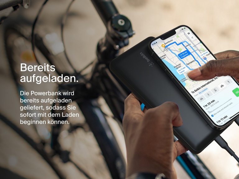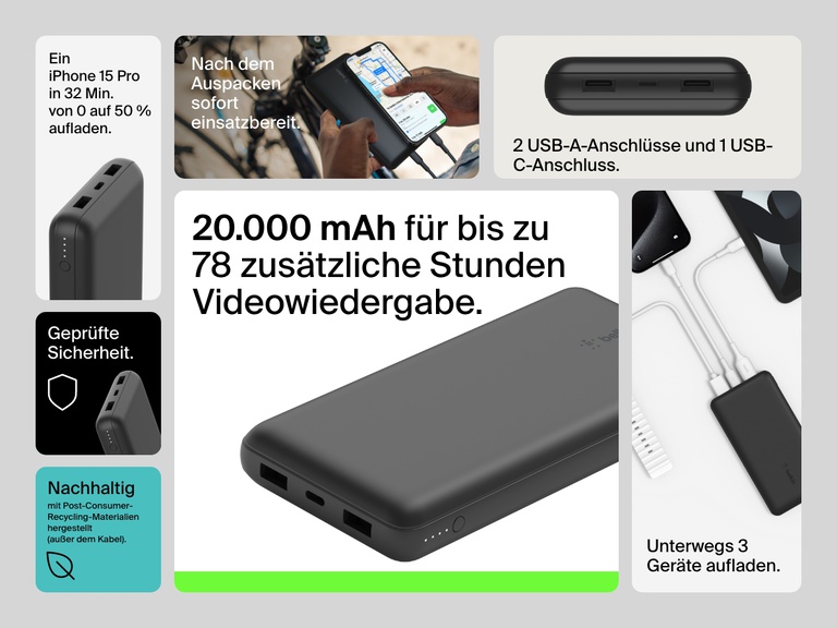 †Die Leistung, die an ein Gerät abgegeben wird, ist geringer und kann abhängig von den jeweiligen Bedingungen unterschiedlich sein. Die maximale zusätzliche Videowiedergabezeit wurde durch einen Vergleich der Kapazität des internen Akkus dieser Powerbank und der maximal erreichbaren Videowiedergabezeit des iPhone 15 Pro unter normalen Bedingungen berechnet. Die tatsächlichen Ergebnisse sind abhängig von den Bedingungen und der Verwendung.