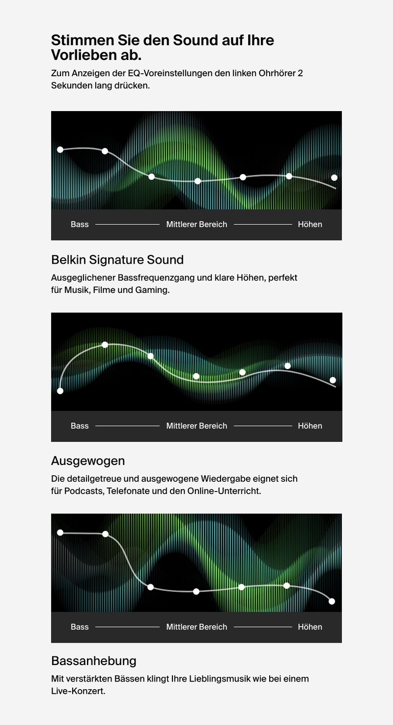 Der True Wireless In-Ear-Kopfhörer eignet sich perfekt zur Verwendung auf dem Weg zur Arbeit sowie für Sport und andere Aktivitäten in Ihrer Freizeit. Die Kopplung mit Bluetooth® erfolgt im Nu und die Bedienung ist ganz einfach. Dank der 12-mm-Treiber und drei EQ-Voreinstellungen können Sie Belkin Signature Sound auf Ihren Bedarf abgestimmt in Hi-Fi-Qualität genießen.
