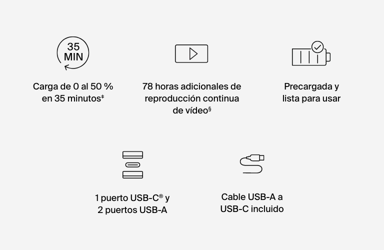 Date maratones de películas y llamadas de FaceTime o mantén las aplicaciones de navegación por GPS abiertas hasta llegar a tu destino. El cable USB-A a USB-C incluido te permite empezar a cargar tus dispositivos y recargar la batería cuando te haga falta sin tener que comprar nada más. Los dos años de garantía del producto y la garantía de los equipos conectados ponen la guinda al pastel y eliminan cualquier duda sobre el producto que puedas tener.