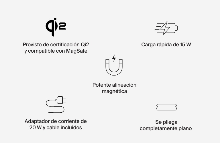 Adquiere este ultracómodo soporte de carga plegable que suministra 15 W de carga inalámbrica rápida a tu iPhone 12, 13, 14, 15 y 16 y otros dispositivos habilitados con Qi2. Este cargador compatible con MagSafe fija tu móvil mediante conexión magnética en posición vertical u horizontal para que puedas ver contenido en su pantalla sin tener que sostenerlo. Además, funciona con el modo En Reposo de pantalla inteligente incluido en iOS 17 para iPhone.