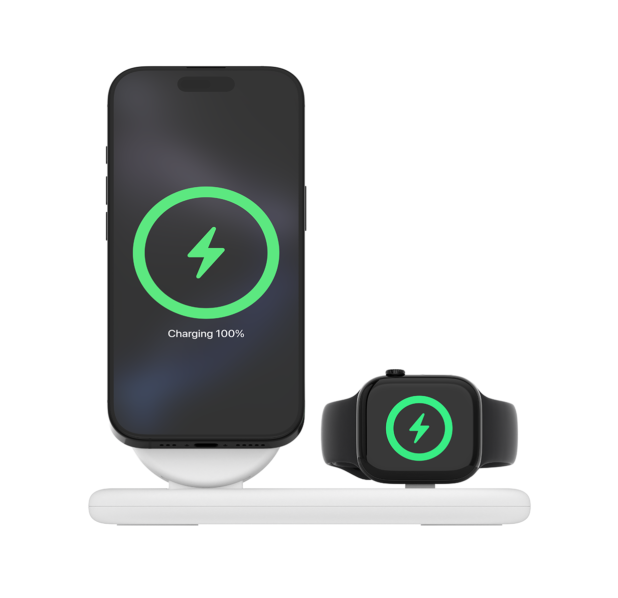 ‡ Según pruebas internas. Este cargador inalámbrico Qi2 de 15 W de Belkin carga un iPhone 15 de 0 al 50 % el doble de rápido que un cargador inalámbrico Qi de 5 W y 1,5 veces más rápido que un cargador inalámbrico Qi de 7,5 W. Los tiempos de carga varían según los factores del entorno; los resultados podrán variar.