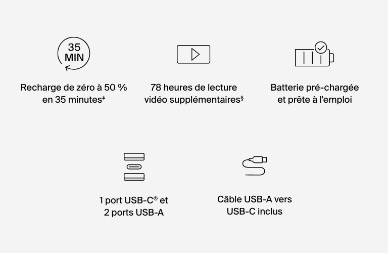 Où que vous soyez, rechargez en simultané jusqu'à trois appareils avec cette batterie externe 20K§ BoostCharge, à la fois puissante et compacte. Elle est dotée de deux ports USB et d'un port USB-C® pour vous offrir 78 heures§ d'autonomie supplémentaire sur votre smartphone et autre appareil mobile.