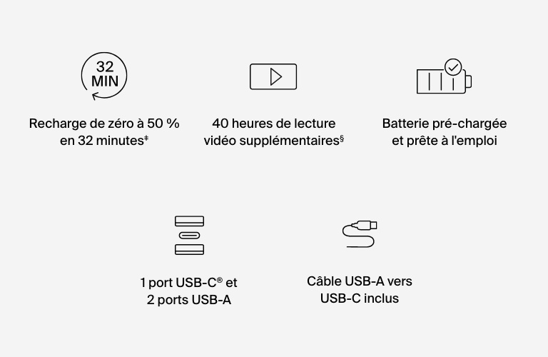 Où que vous soyez, rechargez en simultané jusqu'à trois appareils avec cette batterie externe 10K§ BoostCharge, à la fois puissante et compacte. Elle est dotée de deux ports USB et d'un port USB-C® pour vous offrir 40 heures§ d'autonomie supplémentaire sur votre smartphone et autre appareil mobile.
