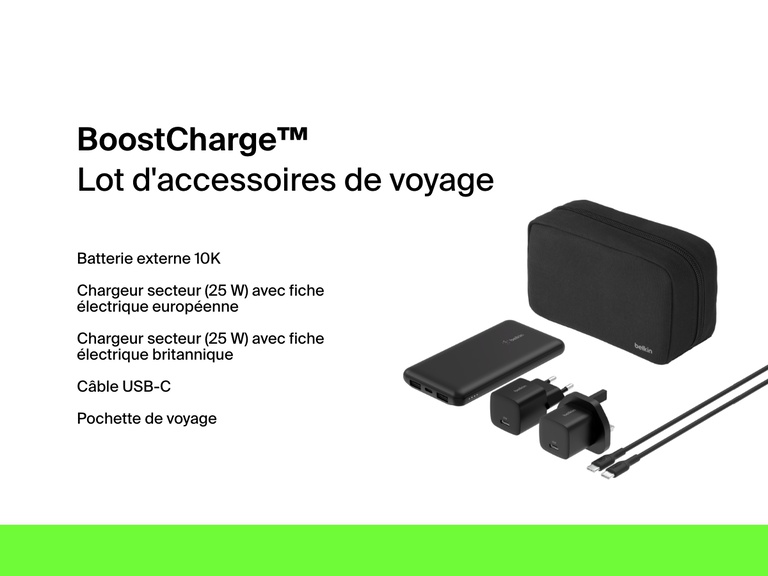 Gardez vos appareils rechargés pendant tous vos déplacements avec notre lot d’accessoires de recharge. Cet ensemble comporte une batterie externe 10K†, 2 chargeurs secteur compacts de 25 W (fiches électriques européenne et britannique), un câble USB-C® de 60 W et une trousse de rangement zippée élégante. La batterie externe vous permet de recharger trois appareils en simultané, et notre chargeur secteur compact recharge vos appareils jusqu’à 25 W. Le câble USB-C vers USB-C (1 m) offre jusqu’à 60 W de puissance.