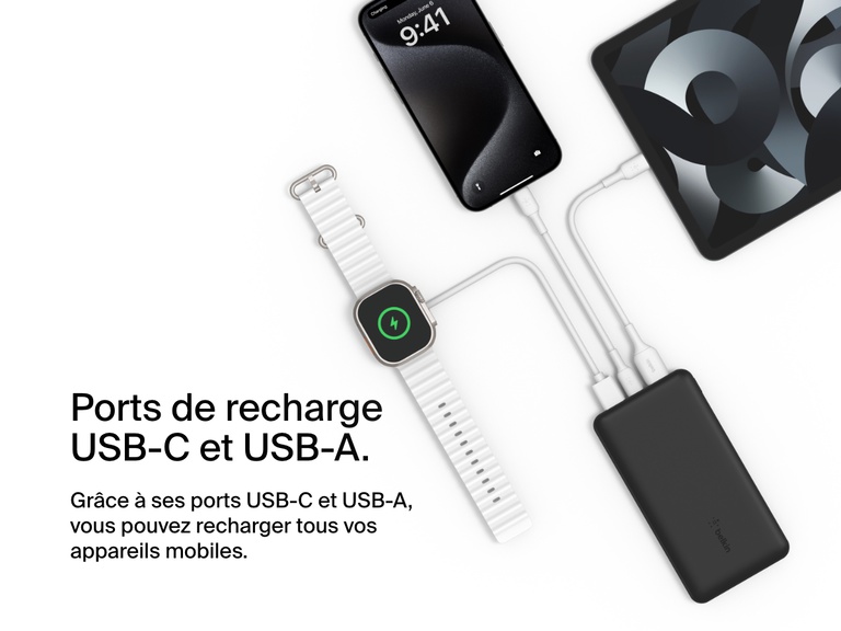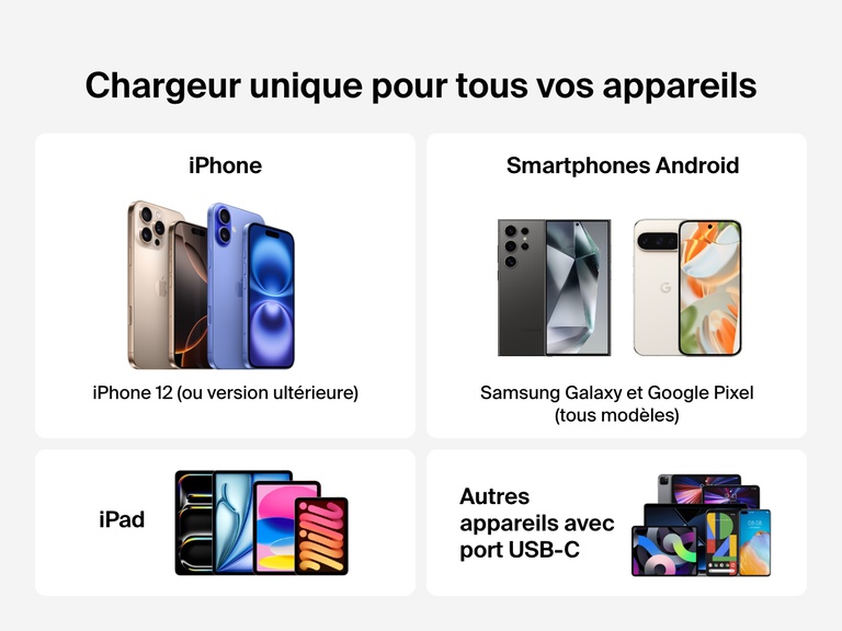 ††La technologie USB-C PD permet de recharger un iPhone 16 Pro ou un Samsung Galaxy S23 de zéro à 50 % en 30 minutes avec un câble USB-C vers USB-C (inclus). Le temps de charge varie en fonction de l’environnement. Les résultats réels sont susceptibles de varier.