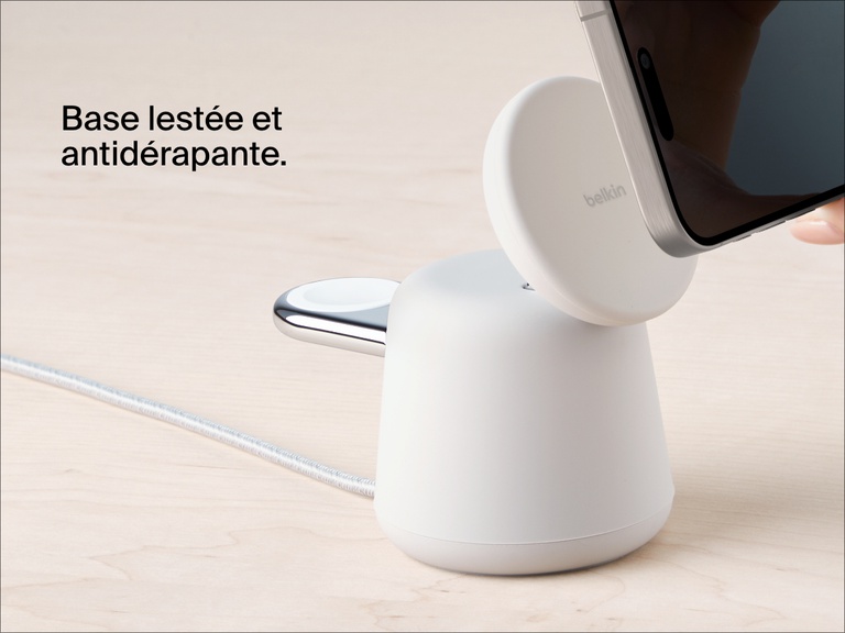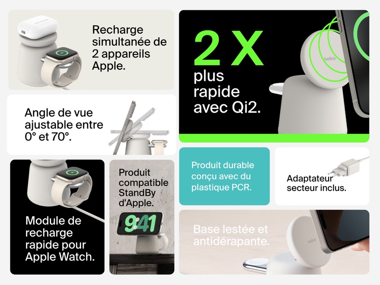 Cette station de recharge pratique vous offre 15 W de recharge sans fil rapide pour votre iPhone 12 (ou version ultérieure), votre Apple Watch 4 (ou version ultérieure) et plusieurs modèles d'AirPods. Grâce à la technologie Qi2, vous profitez d’une connexion sécurisée en posant simplement votre iPhone sur la station de recharge. Et vous profitez d'une recharge 2 fois plus rapide qu'une recharge sans fil conventionnelle. Cette dernière est compatible avec le mode veille d'Apple (mode En veille ou StandBy). Vous pouvez donc pivoter votre iPhone dans la position de votre choix.