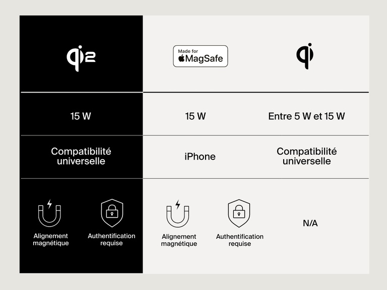 Sur la base de tests réalisés en interne. Le chargeur Qi2 (15 W) de Belkin recharge un iPhone 15 de zéro à 50 % jusqu'à 2 fois plus vite qu'un chargeur Qi de 5 W et jusqu'à 1,5 fois plus vite qu'un chargeur Qi de 7,5 W. Le temps de charge varie en fonction de l’environnement. Les résultats réels sont susceptibles de varier.