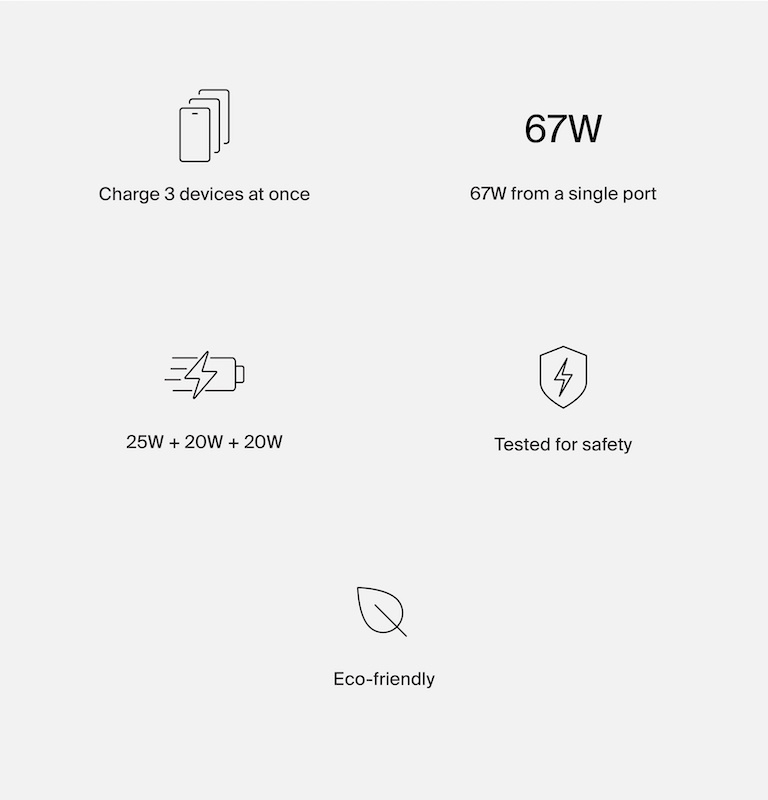 使用我們配備 PPS 67W 的 3 連接埠 USB-C 家用充電器,可一次為三部裝置快速充電,或以 67W 的功率為筆記型電腦充電。 三個帶有 PPS 的 USB-C PD 連接埠可為所有相容設備提供快速充電。 它支援各種 USB-C 智慧型手機、平板電腦和筆記型電腦。