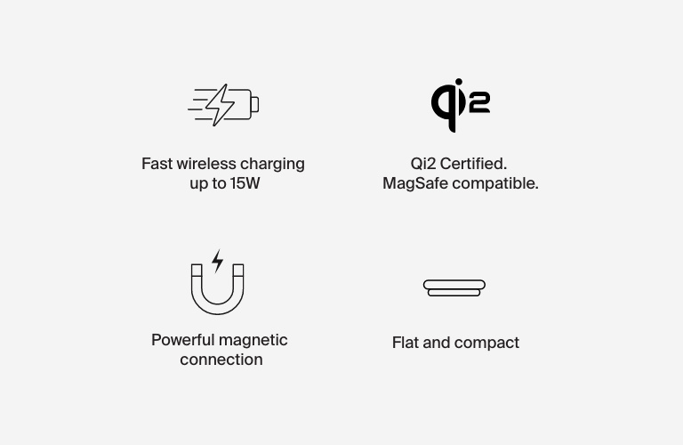 這款超方便的磁吸充電板可透過 USB-C® 為您的 iPhone 15 提供 15W 的快速無線充電,為您的 AirPods 提供 5W 的快速無線充電,為其他裝置提供 5W 的快速無線充電。利用 Qi2 磁吸技術,您可以將 iPhone 放置在充電板上,實現安全、對齊的連接,從而將能源使用高效化並保障設備的電池壽命。