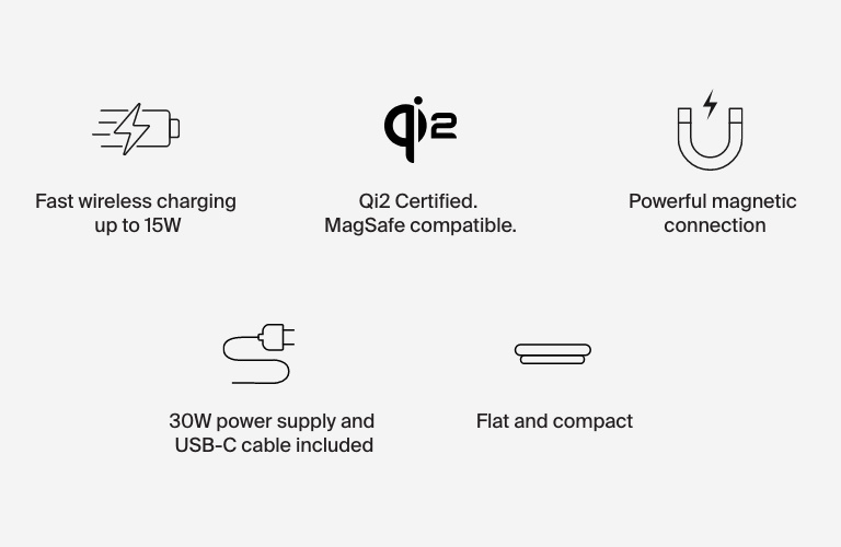 為您的 iPhone 15 和其他支援 Qi2 的裝置提供 15W 快速無線充電,為您的 AirPods 提供 5W 快速無線充電,並透過 5W USB-C® 為 Apple Watch 充電器快速充電。 利用 Qi2 無線充電,只需將您的 iPhone 放在充電板上即可實現安全、對齊的連接 – Qi2 可優化能源使用並保障設備的電池壽命。
