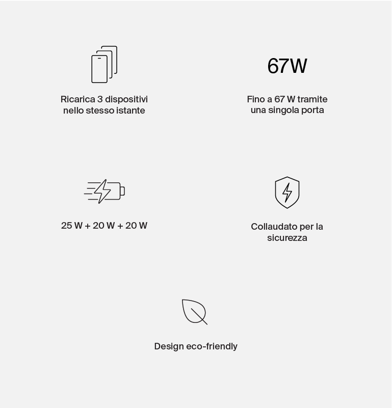 Alimenta rapidamente tre dispositivi nello stesso istante o ricarica un laptop con una potenza di 67 W, grazie al nostro caricabatteria da parete a 3 porte USB-C con PPS da 67 W. Le tre porte USB-C PD con PPS garantiscono una ricarica rapida per tutti i dispositivi compatibili. Supporta un'ampia gamma di smartphone, tablet e laptop con tecnologia USB-C. La confezione include un cavo da USB-C a USB-C per iniziare a ricaricare da subito.