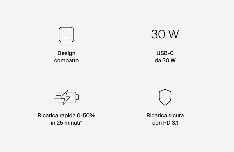 Ricarica un iPhone, un iPad o un altro dispositivo compatibile con il nostro caricabatteria da parete USB-C da 30 W. Include una certificazione USB-C PD 3.1 ed è perciò compatibile con un'ampia gamma di dispositivi, inclusi smartphone e tablet di marca Apple, Google e Samsung, e altri dispositivi dotati di USB-C PD.