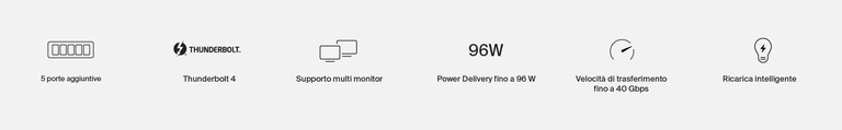 L'hub permette di collegare in configurazione daisy-chain fino a 6 dispositivi con tecnologia Thunderbolt. Inoltre, la porta USB-A consente di collegare dispositivi aggiuntivi che non supportano la tecnologia Thunderbolt.