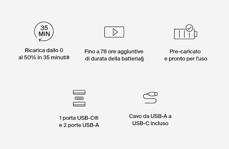 **Il massimo di ore di riproduzione video aggiuntive è stato calcolato confrontando la capacità delle celle del power bank con il massimo di ore di riproduzione video raggiungibile da un dispositivo iPhone 15 Pro in condizioni d'uso normali. I risultati effettivi dipenderanno da una serie di fattori, in base a ciascun utente.
