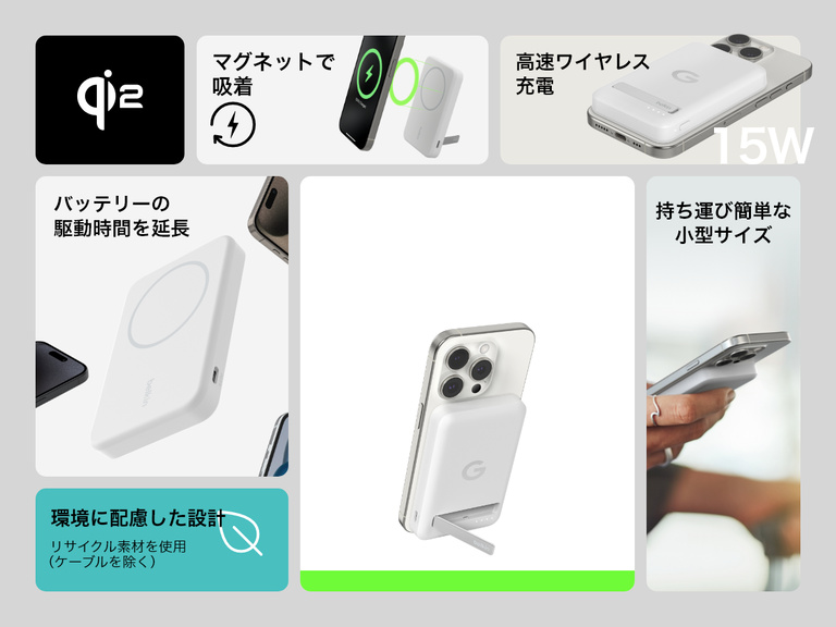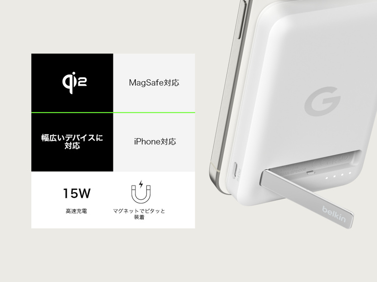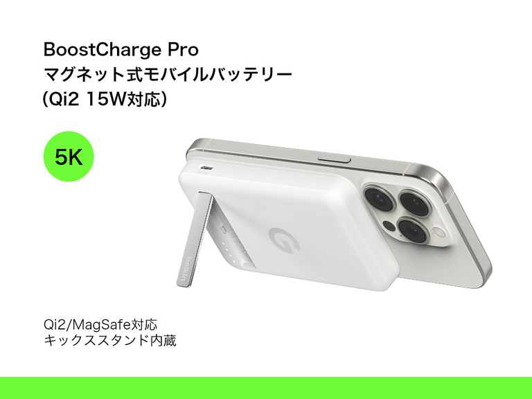 BoostCharge Pro Qi2 15Wモバイルバッテリー5000mAh§で、iPhoneやQi2対応スマートフォンをワイヤレスですばやく安全に充電できます。Qi2およびMagSafe対応デバイスを、外出先でも最大15Wで簡単かつシームレスに充電できます。付属の折りたたみ式スタンドを使用すると、—デバイスの充電中も 最適な角度でビデオ視聴、ストリーミング、コンテンツ作成をお楽しみいただけます。
