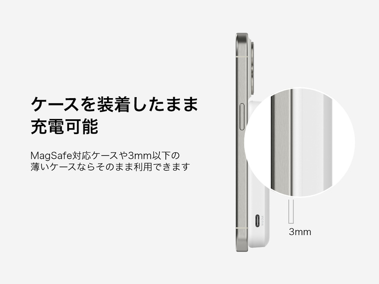 §5,000mAhのバッテリーを内蔵。デバイスに対す放電量はわずかですが、条件や使用状況によって異なります。*iPhone 15の通常の条件での最長の動画再生時間と、本モバイルバッテリーの内臓電池の容量を比較して算出した、最長の追加動画再生時間です。 実際の結果は、条件や使用状況によって異なります。