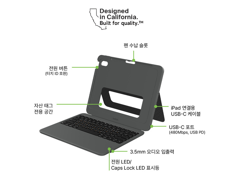 10세대 및 A16 iPad 전용으로 특별히 설계된 올인원 키보드 케이스입니다. 가정이나 학교에서 학습하는 학생들에게 완벽한 솔루션을 제공합니다. USB-C 포트로 간편하게 연결하여 무선 페어링의 번거로움이 없습니다. 생활 방수 키보드와 미 국방부 표준(Military-Grade) 수준의 충격 방지 설계로 소중한 iPad를 안전하게 보호합니다. 추가 3.5mm 오디오 및 USB-C 포트를 통해 충전 및 디스플레이 출력을 동시에 지원합니다. 이 편리한 도구는 효과적인 e-러닝 환경을 만들어주며 안티 팝오프 키캡 설계로 흔들림 없는 타이핑을 제공합니다. 기능적이고 보호력이 뛰어난 키보드 폴리오로 iPad를 강력한 학습 도구로 변화시키세요.