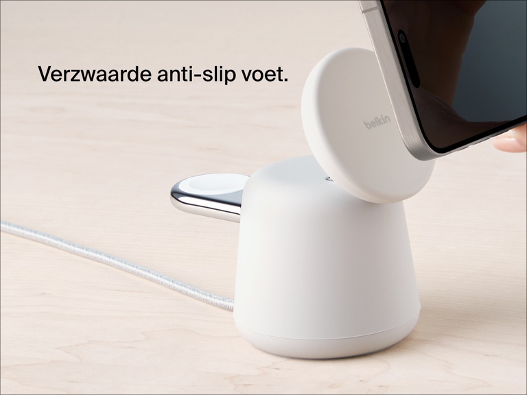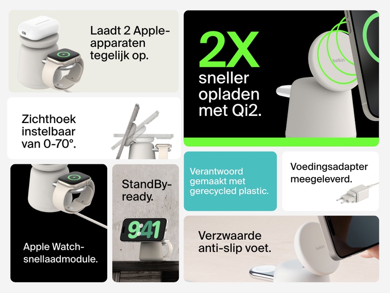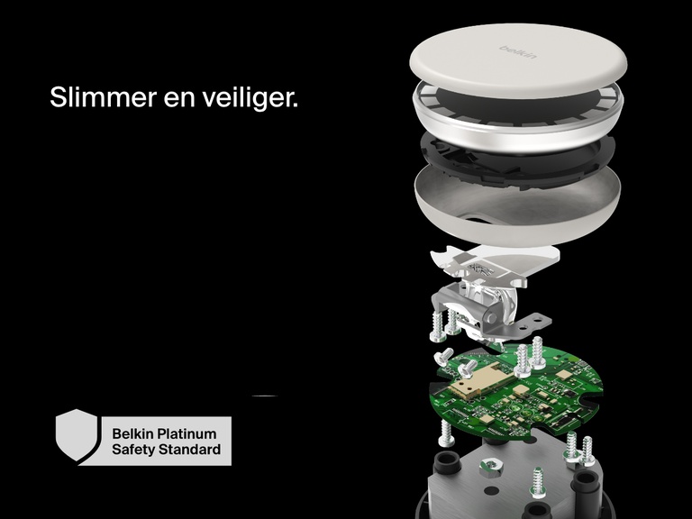†Gebaseerd op interne testen. De draadloze Qi2 15W-lader van Belkin laadt een iPhone 15 twee keer sneller van 0-50% op dan een draadloze Qi 5W-lader, en anderhalf keer sneller dan een draadloze Qi 7,5W-lader. De laadtijd is afhankelijk van omgevingsfactoren; de werkelijke resultaten variëren.