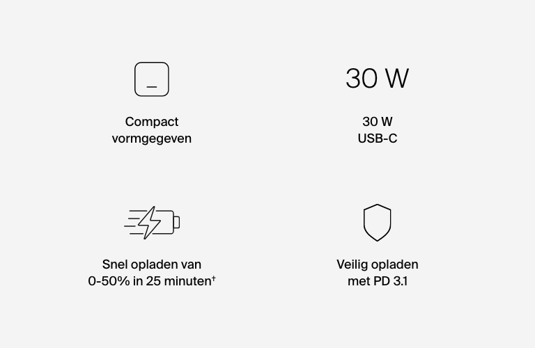 †USB-C PD-technologie laadt een iPhone 16 van 0% tot 50% op in 24 minuten of een Samsung S25 van 0% tot 50% in 26 minuten bij gebruik van een USB-C-/USB-C-kabel. De laadtijd is afhankelijk van omgevingsfactoren; de werkelijke resultaten variëren.