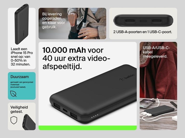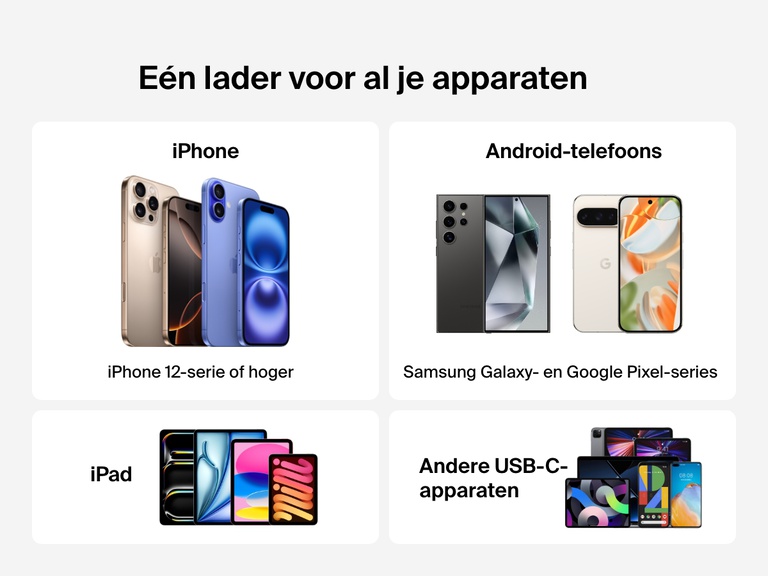 ††USB-C PD-technologie laadt een iPhone 16 Pro of een Samsung Galaxy S23 van 0-50% op in 30 minuten bij gebruik van een USB-C/USB-C-kabel (niet meegeleverd). De laadtijd is afhankelijk van omgevingsfactoren; de werkelijke resultaten variëren.