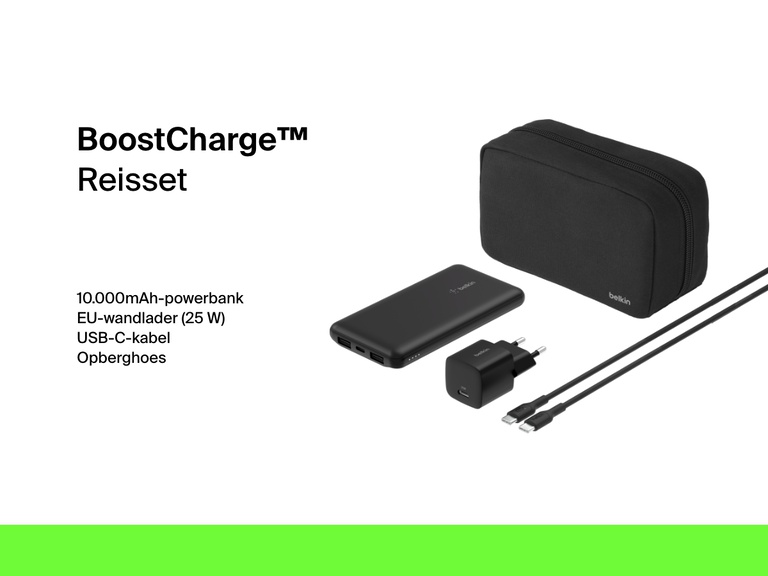Met onze oplaadbundel zorg je ervoor dat je batterij nooit leeg raakt. De set bestaat uit een 10.000mAh-powerbank†, een compacte 25W-wandlader, een 60 W USB-C®-kabel en een stijlvol opbergtasje met ritssluiting. Met de powerbank kun je drie apparaten tegelijk opladen en onze compacte oplader levert tot 25 watt voor het opladen van de nieuwste apparaten. De meegeleverde USB-C/USB-C-kabel van 1 m ondersteunt opladen met een vermogen tot 60 watt.