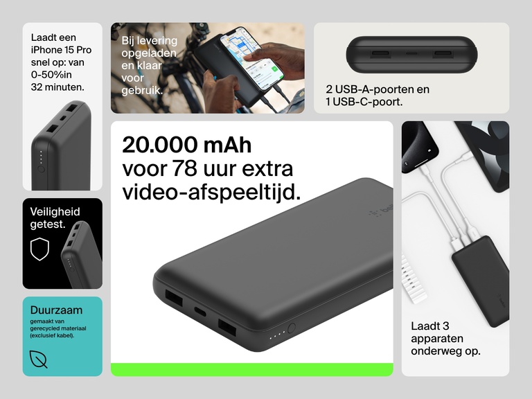 ††USB-C PD-technologie laadt een iPhone 16 Pro of een Samsung Galaxy S23 van 0-50% op in 30 minuten bij gebruik van een USB-C/USB-C-kabel (niet meegeleverd). De laadtijd is afhankelijk van omgevingsfactoren; de werkelijke resultaten variëren.
