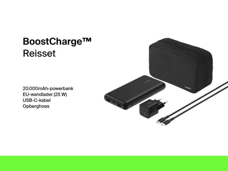 Met onze oplaadbundel zorg je ervoor dat je batterij nooit leeg raakt. De set bestaat uit een 20.000mAh-powerbank†, een compacte 25W-wandlader, een 60 W USB-C®-kabel en een stijlvol opbergtasje met ritssluiting. Met de powerbank kun je drie apparaten tegelijk opladen en onze compacte oplader levert tot 25 watt voor het opladen van de nieuwste apparaten. De meegeleverde USB-C/USB-C-kabel van 1 m ondersteunt opladen met een vermogen tot 60 watt.