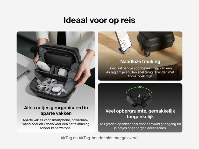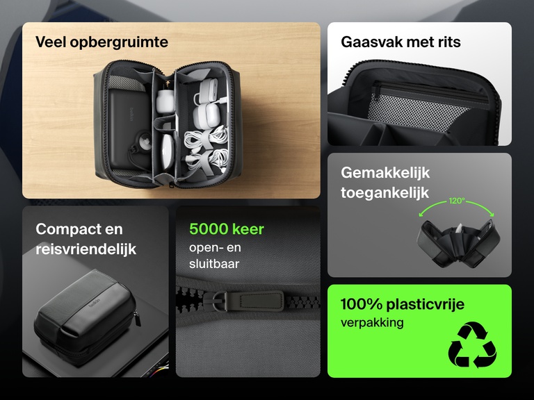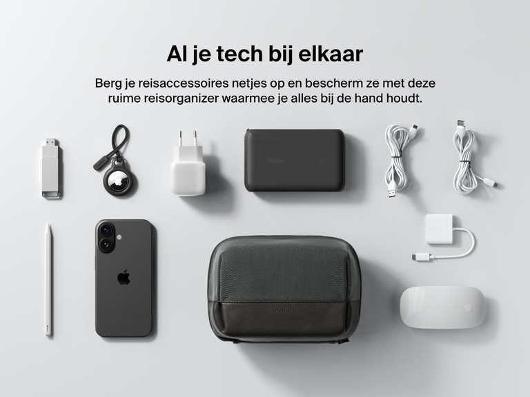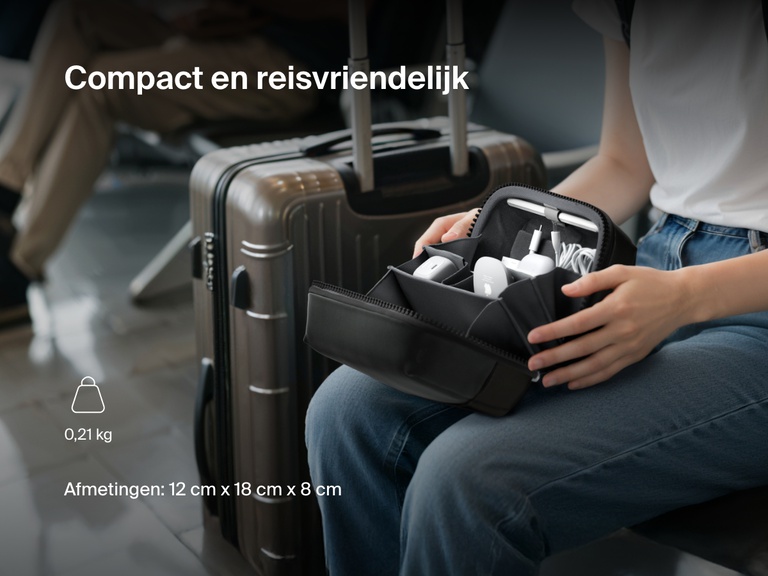 Ontdek ons nieuwe accessoire: de reisorganizer voor tech-accessoires. Deze slanke, stijlvolle tas houdt je elektronica netjes opgeborgen en gemakkelijk toegankelijk. Hij heeft verschillende vakken voor een powerbank, wandlader, muis en meer en is daarmee ideaal voor de techliefhebber die vaak onderweg is.