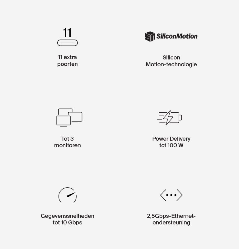 Het universele Pro 11-in-1 USB-C-dockingstation werkt met Silicon Motion-technologie voor meer vermogen en productiviteit, is compatibel met Mac-, Windows- en Chromebook-apparaten en ondersteunt de aansluiting van drie externe monitoren. Vergroot je productiviteit en profiteer van gegevensoverdracht met 10 Gbps en Power Delivery tot 100 W.