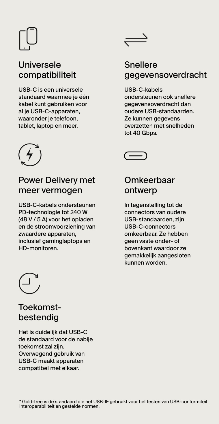 * Disclaimer: USB-C/USB-C-kabel ondersteunt snelladen van je apparaat met een vermogen tot 60 W (3 A / 20 V) en laadt een Samsung Galaxy S23 Ultra van 0-50% op in 27 minuten. (CAB014 ondersteunt tot 100 W (5 A / 20 V)