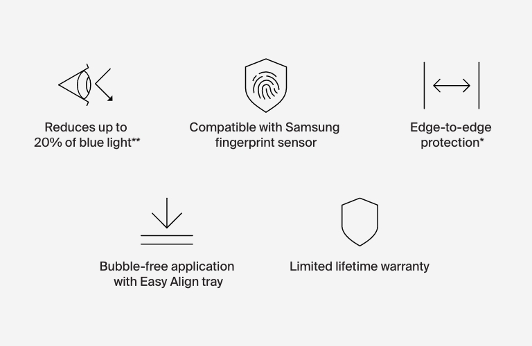 Our screen protector offers a blue light filter** for more enjoyable screen time. Get more protection for your Galaxy phone screen with a thin yet durable TrueClear Curve Blue Light Filter Screen Protector that has a premium, glass-like feel.