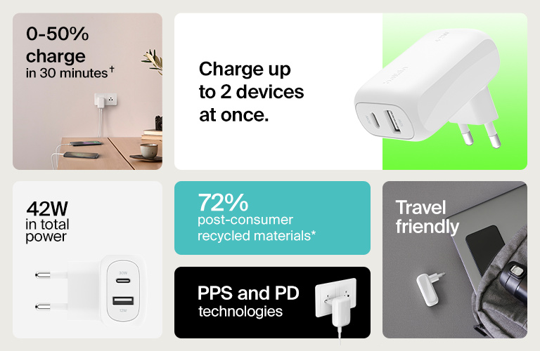 Fast charge an iPhone or Samsung smartphone while you charge another device at the same time with our Dual Wall Charger 42W. Dual ports include a 30W USB-C port and a 12W USB-A port. It’s USB-C PD 3.0 certified to deliver fast charging of 0-50% in 21 minutes for iPhone† or 0-50% in 26 minutes for Samsung††.