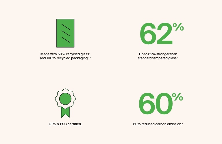 與非回收螢幕保護貼相比,使用 InvisiGlass,我們的碳排放量平均減少了60%。&箭號; 這項改進讓我們能夠走上實現碳中和目標的軌道。