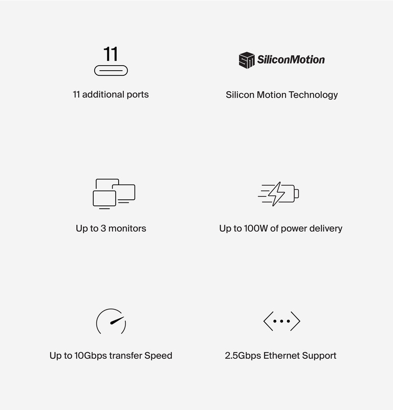 The Universal USB-C 11-in-1 Pro Dock adds power and productivity to your setup with Silicon Motion technology, Mac, Windows, and Chromebook compatibility, and expansion up to 3 monitors. Get more done with 10Gbps transfer speeds and up to 100W of PD.