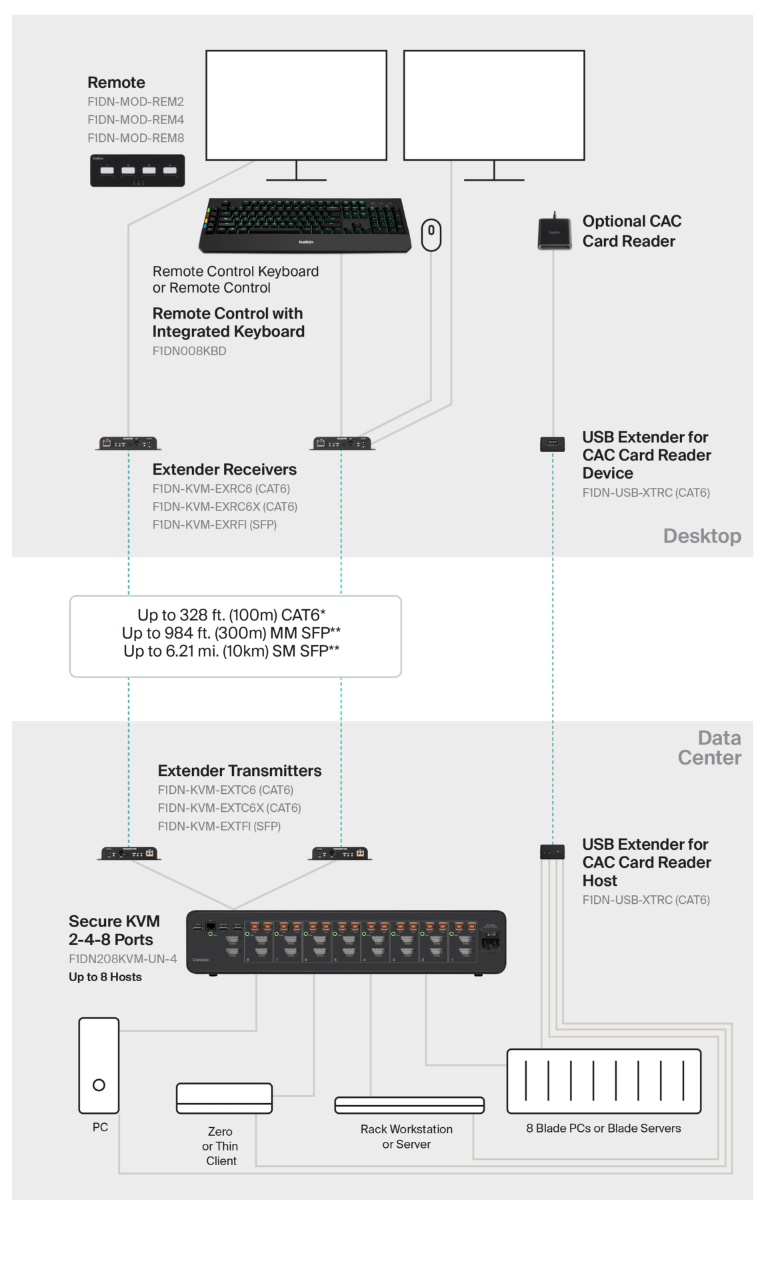 This Belkin Extender Receiver solves security and distance issues with revolutionary technology that enables enclave switching control over a long distance from a user’s desktop. Transmit and receive up to 328 ft. (100 m) away with peace of mind that the processing side and the Secure KVMs are located in a locked, secure datacenter or SCIF (Sensitive Compartmented Information Facility) as opposed to the desktop.