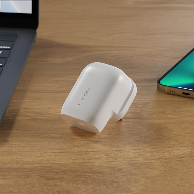 †In internal testing, USB-C PD technology charges iPhone 14 Pro from 0–50% in 23 minutes when paired with a USB-C cable with Lightning connector (not included). Actual results will vary depending on varying factors, including device age, model, and usage environment, for individual users.